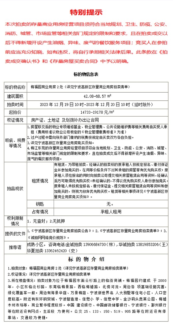 宁波高新区存量商业用房竞买须知和拍卖清单请登录诚拍网www.chengpw.com自行下载,拍卖清单中列明拍卖标的地址、房号、建筑面积、起拍价等。 |