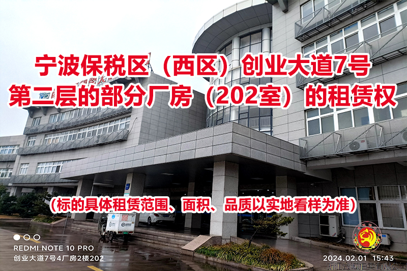 一、拍卖标的:位于宁波保税区(西区)创业大道7号第二层的部分厂房(202室)的租赁权,租赁面积约743.3㎡(标的具体租赁范围、面积、品质以实地看样为准),租期三年,租金每三个月一付,先付后用。年租金起拍价124874.4元,竞买保证金3万元(不计息)。