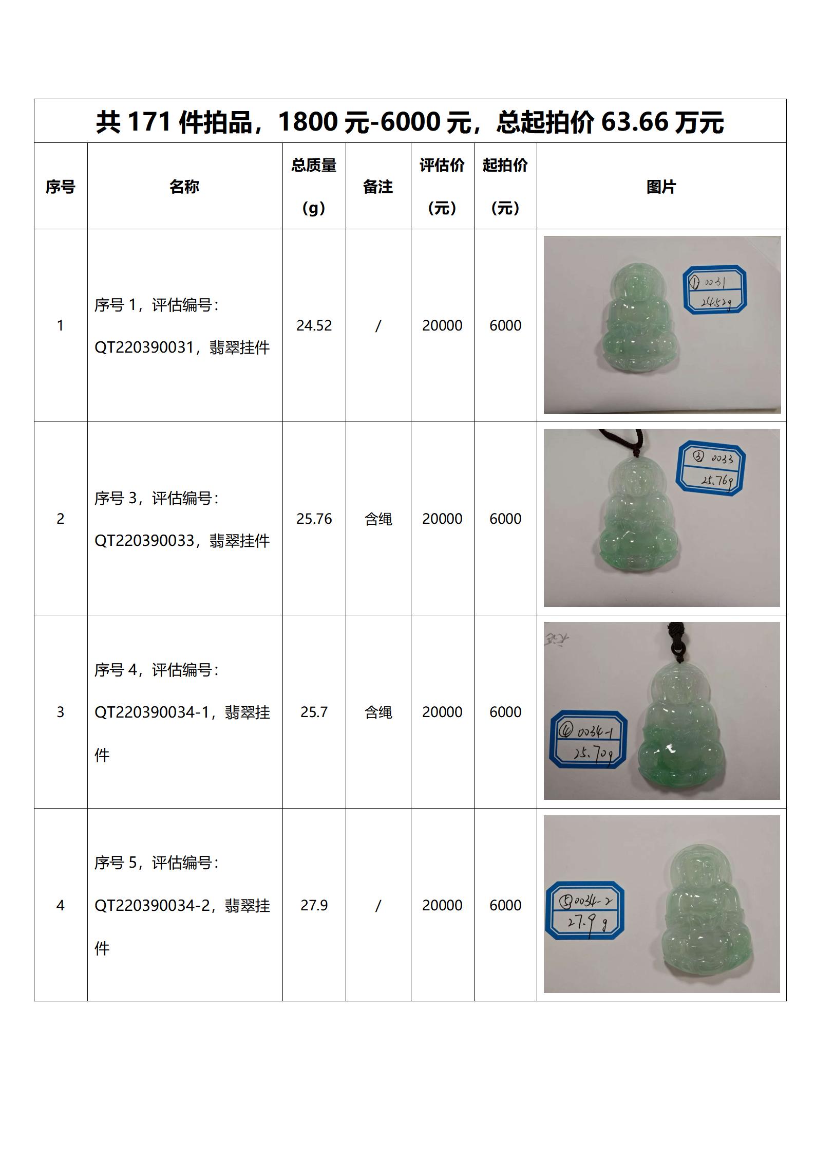 本次拍卖标的为171件翡翠饰品,详见《翡翠饰品拍卖清单》,并在“诚拍网”(www.chengpw.com)上下载。