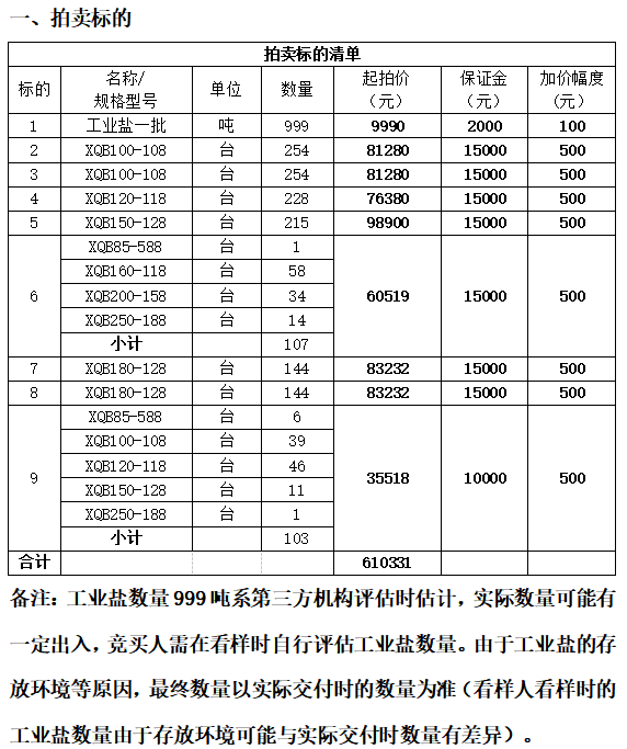 备注:工业盐数量999吨系第三方机构评估时估计,实际数量可能有一定出入,竞买人需在看样时自行评估工业盐数量。由于工业盐的存放环境等原因,最终数量以实际交付时的数量为准(看样人看样时的工业盐数量由于存放环境可能与实际交付时数量有差异)。
